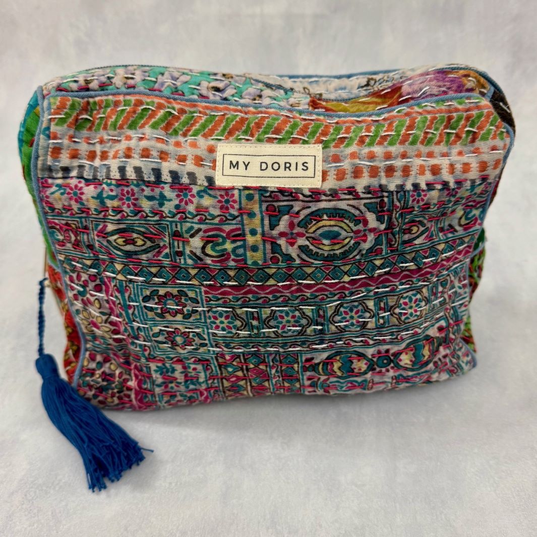 Each of the upcycled wash bags by My Doris is beautifully handcrafted from recycled cotton blankets, hand-dyed tassels, with a unique quilted pattern on each garment. No two are the same. Cotton lined with rigged base to hold shape.