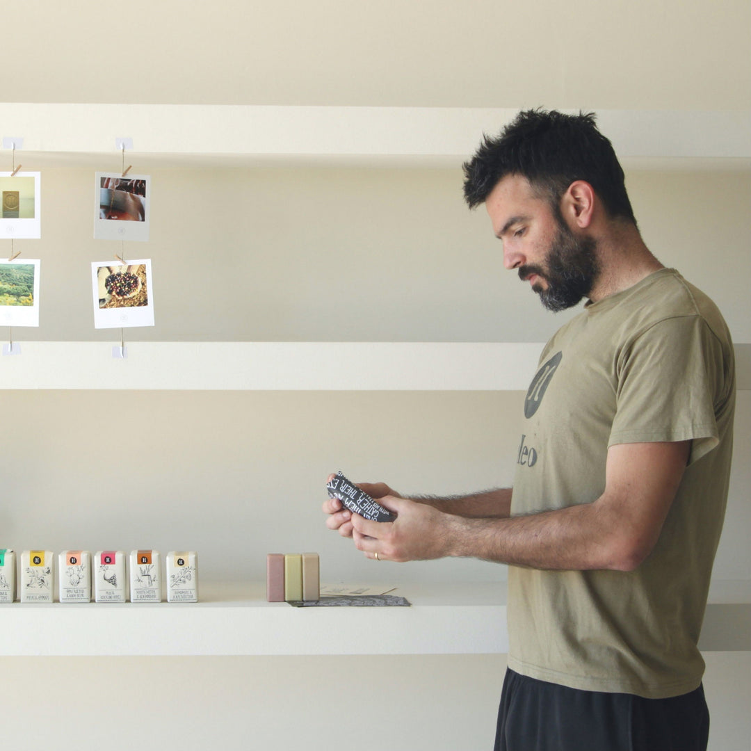 The uniqueness of Helleo products is illustrated on its beautifully designed packaging. Each soap is hand wrapped in recycled paper and comes with a note from Manos sharing the story of the soap from the time of sowing until the finished product.