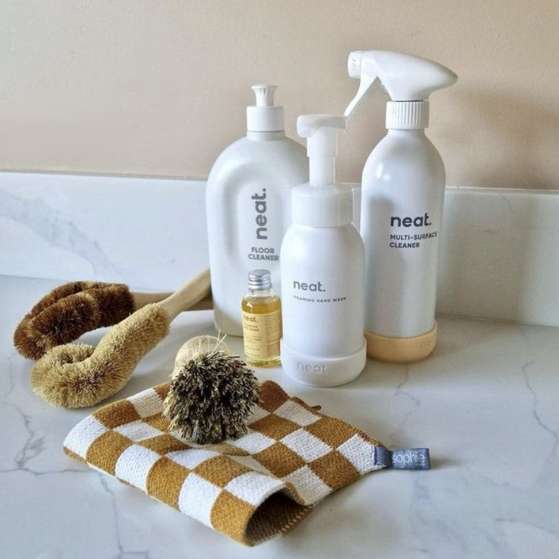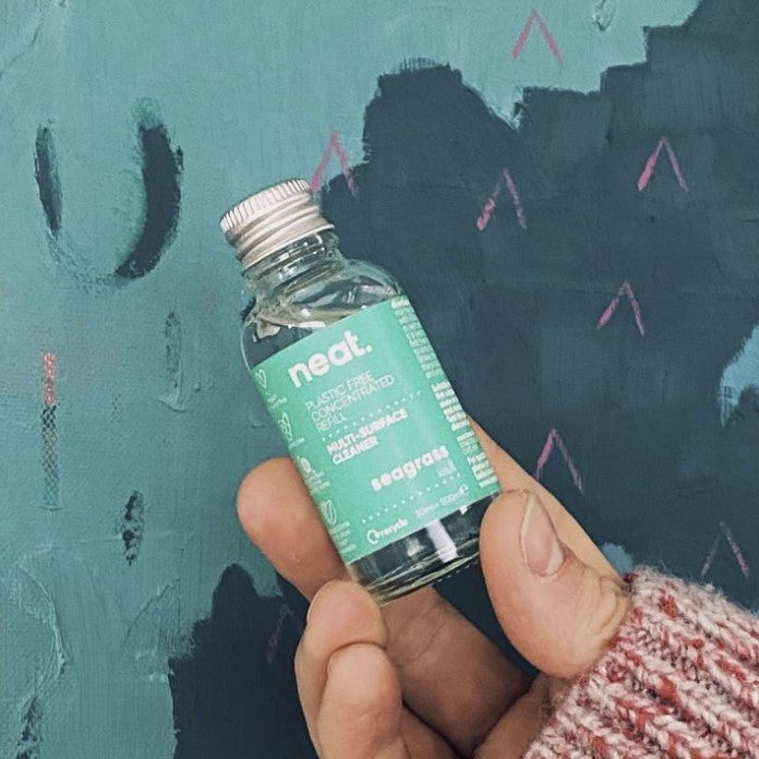 Neat cleaning products are concentrated, so no more shipping unnecessary water and no more plastic bottles of cleaning products. Simply mix them with tap water in the reusable aluminium spray bottle and you have great cleaning products without the plastic waste.