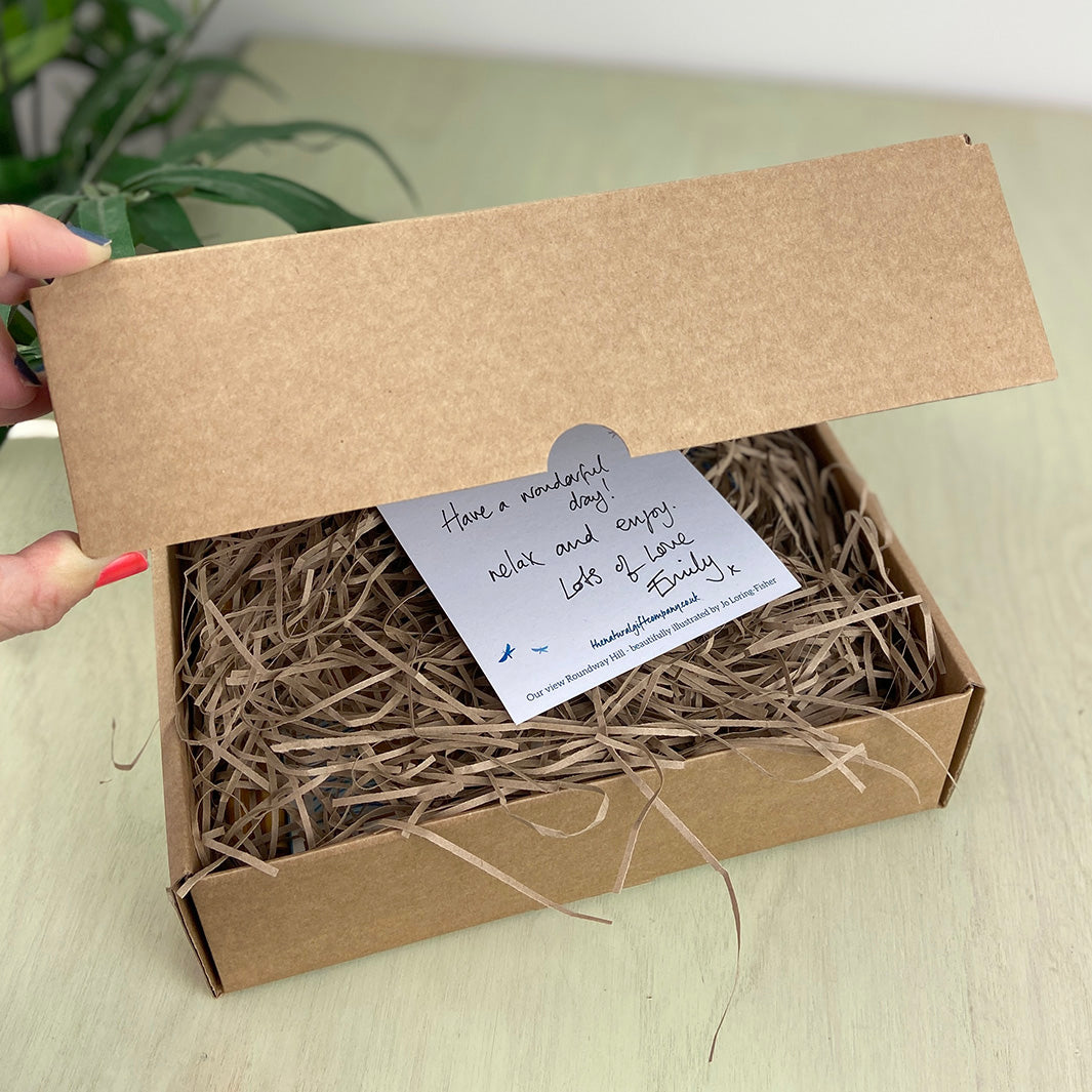 postcard with a hand written personalised message. We also now offer a gift wrapping service for an extra £2.50. Your gift will be wrapped in tissue paper, packed in a natural cardboard box and hand tied with a natural paper ribbon bow