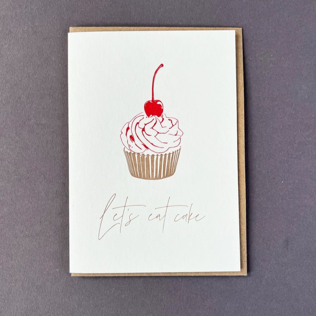 This gorgeous letterpress greeting card Cherry Cake is illustrated with a yummy cupcake with a cheery on top. Printed in metallic gold and neon red, with modern calligraphy “Let's eat cake”. The perfect card to send to your cake loving friend on their birthday.