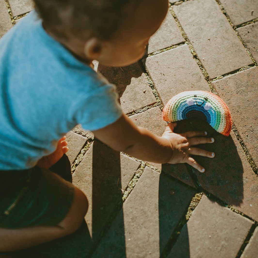 This cute and colourful rainbow rattle is hand crocheted from soft organic cotton yarn so is safe for newborns and teething babies. Its gentle sound and friendly smiling face will appeal equally in the toddler years, being fun for colour recognition.