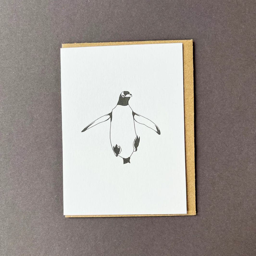 This gorgeous little letterpress notecard is illustrated with a jumping gentoo penguin, wings outstretched. Printed in black showing the penguin's silhouette. Perfect to send to any penguin lover for their birthday, to say thank you or just because.